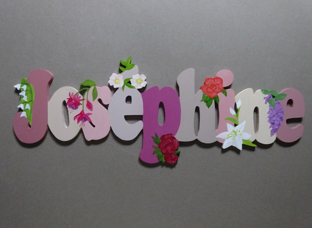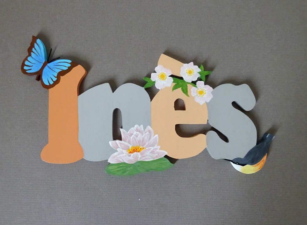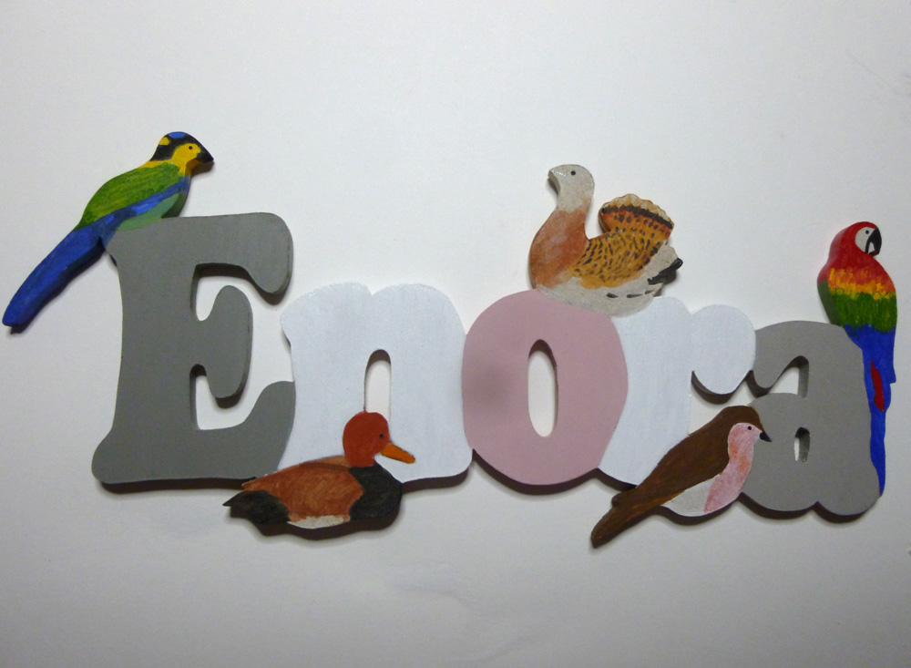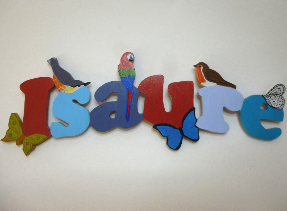 Chaque prénom est découpé soigneusement dans du bois et peint à la main.